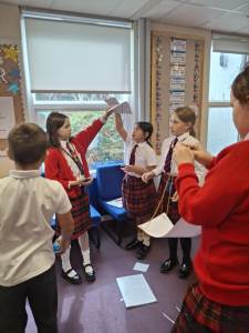 In our science lesson, we made telephones using plastic cups and string to investigate how sound travels. We spoke into one cup and listened at the other to see what would happen. We tested different lengths of string and also tried pulling the string loosely and tightly. We discovered that the sound travelled best when the string was pulled tight and was longer. This is because the vibrations from our voices moved more easily along the string when it was stretched, carrying the sound more clearly from one cup to the other.