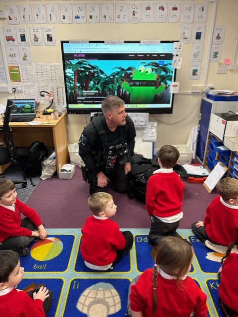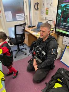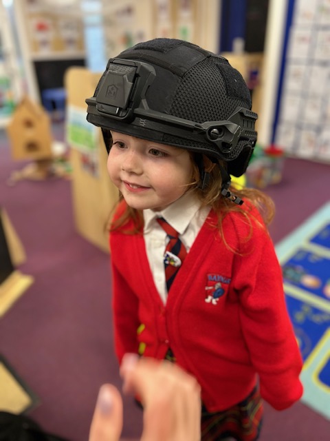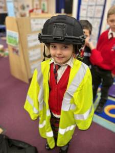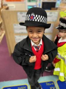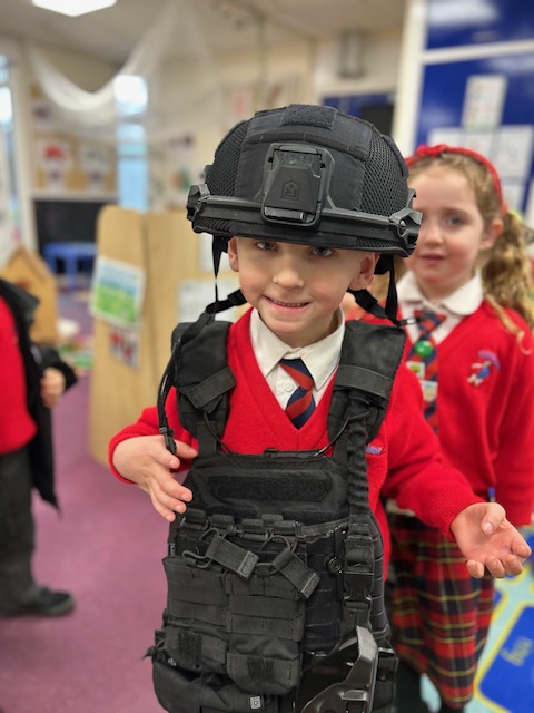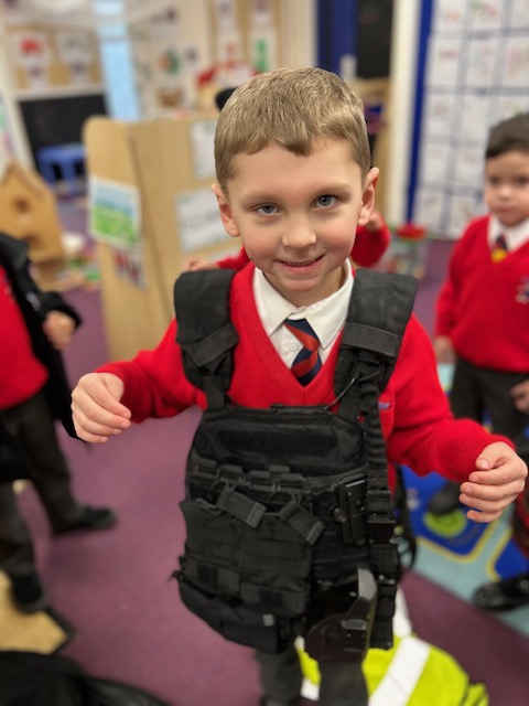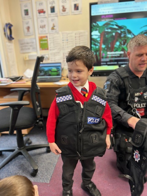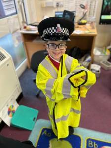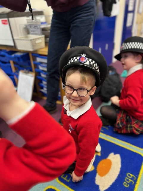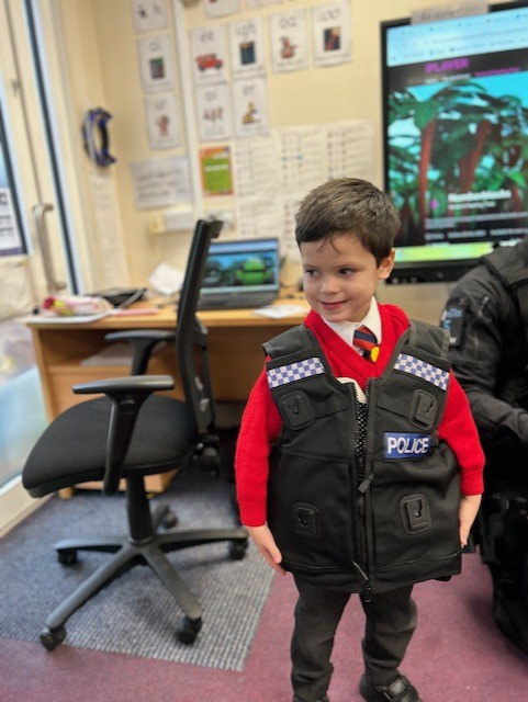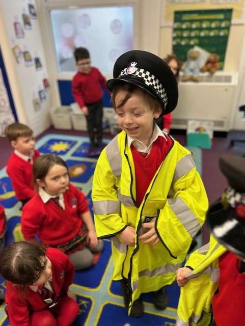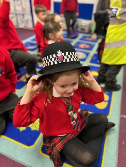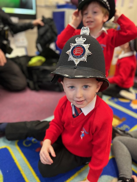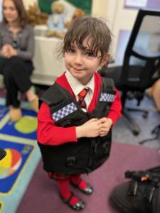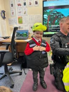 The weather may have been wet and windy, but the children were full of enthusiasm for the visit today! As well as getting to look around the police car, the children got to ask lots of questions, and then try on some REAL police uniform! What a great way to spend the morning!