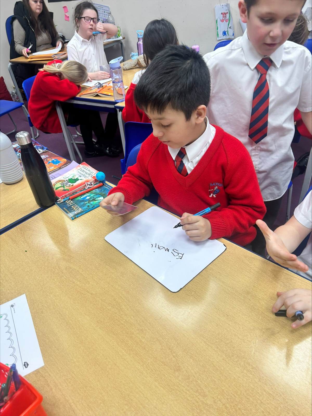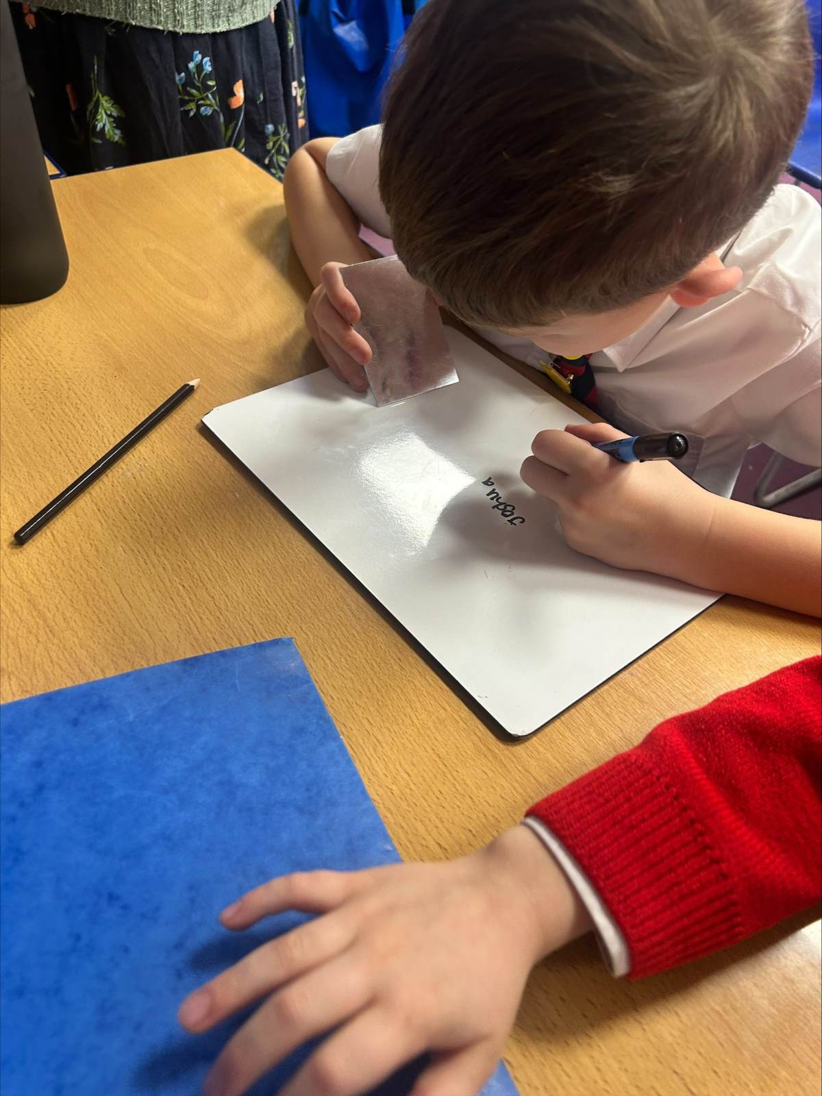 The children in class 3 enjoyed a science lesson where they were looking at reflective and non reflective surfaces. Children wrote their name and they were only allowed to look in the mirror whilst doing so- not as easy as they thought it would be!