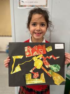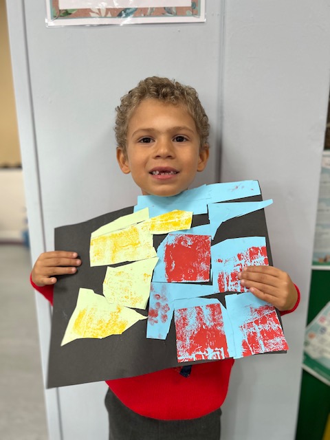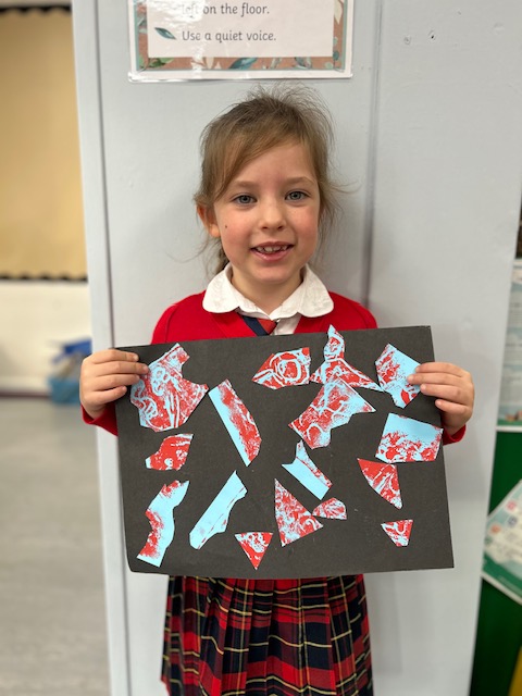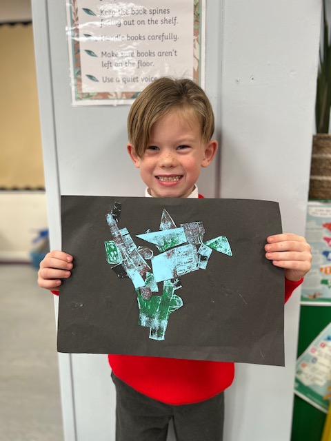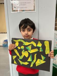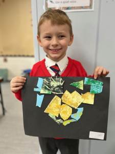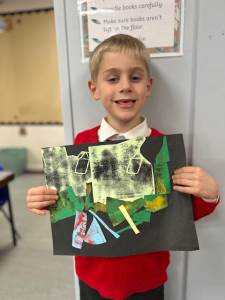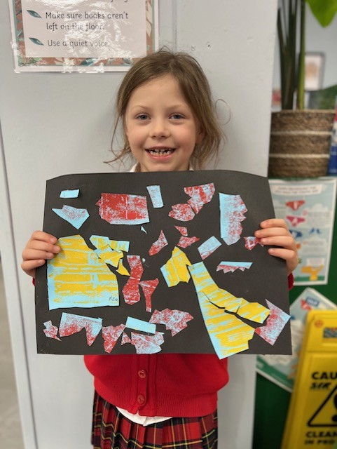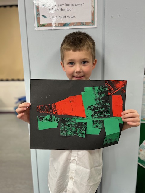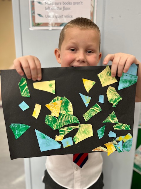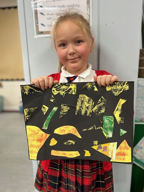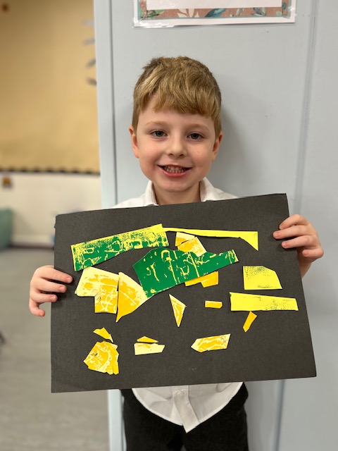 Class 2's Art topic was 'Map it out' - they made abstract art out of printed maps of their journey to school. They enjoyed printing and then using their own prints to create a piece of abstract art. Well done!