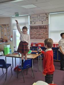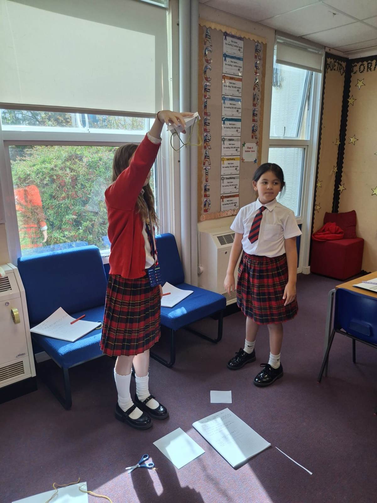 Class 4 are investigating air resistance in their science lesson. In groups, they worked together to test different size parachutes to see which ones worked best. They had to ensure their investigations were fair by making sure all the variables other than the size of the parachute remained the same