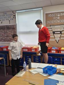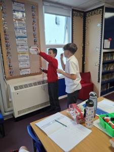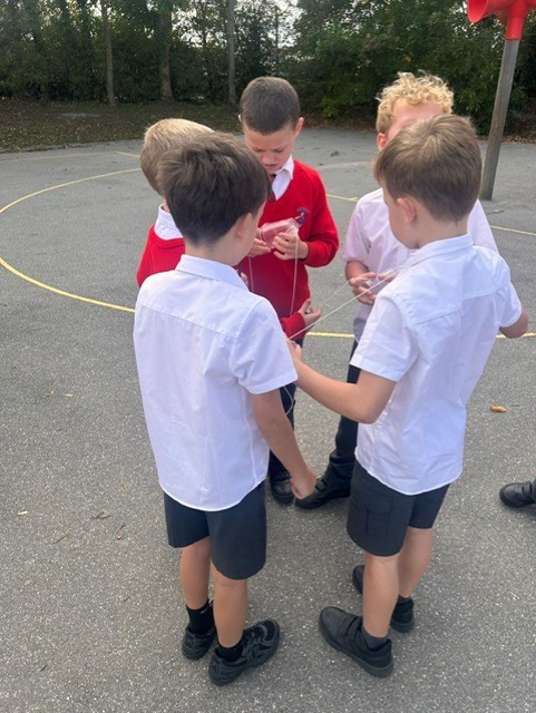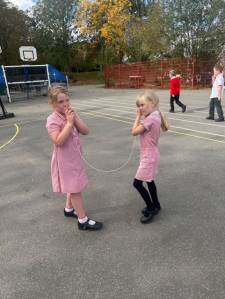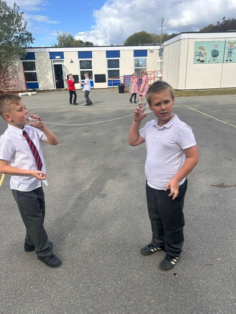 In our science lesson, we made telephones using plastic cups and string to investigate how sound travels. We spoke into one cup and listened at the other to see what would happen. We tested different lengths of string and also tried pulling the string loosely and tightly. We discovered that the sound travelled best when the string was pulled tight and was longer. This is because the vibrations from our voices moved more easily along the string when it was stretched, carrying the sound more clearly from one cup to the other.