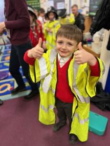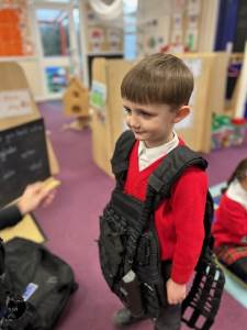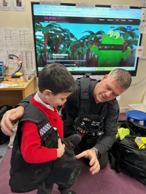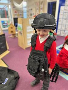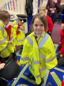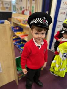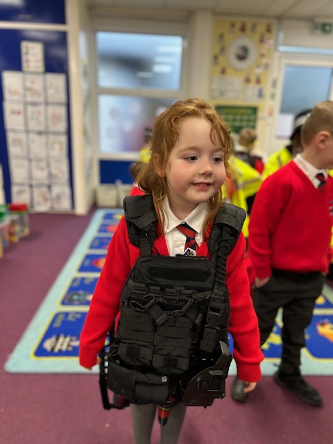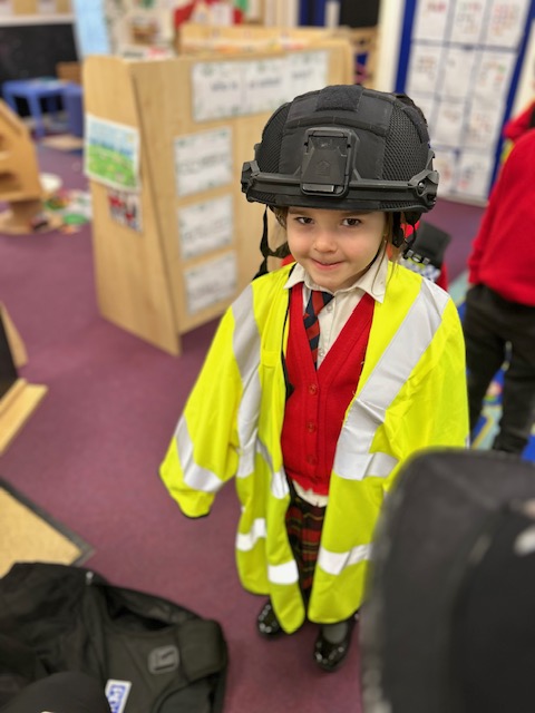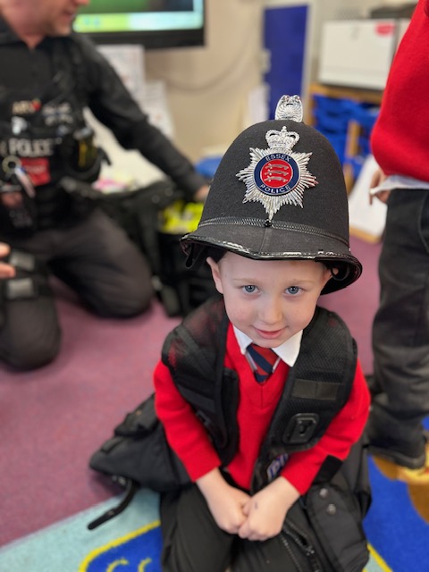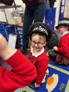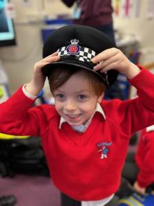 The weather may have been wet and windy, but the children were full of enthusiasm for the visit today! As well as getting to look around the police car, the children got to ask lots of questions, and then try on some REAL police uniform! What a great way to spend the morning!