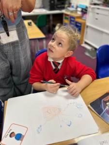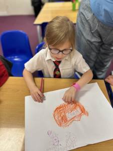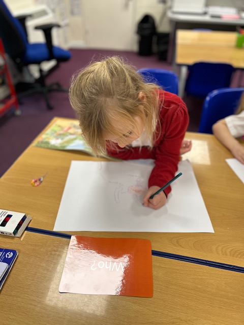 Some children have been working with Mrs Alcon to improve their writing. They are using Colourful Semantics which is a fun and visual way to help children understand and build sentences. It uses colours to represent different parts of a sentence, helping children understand how words fit together to make meaning.
