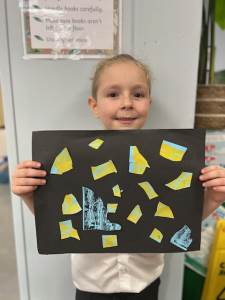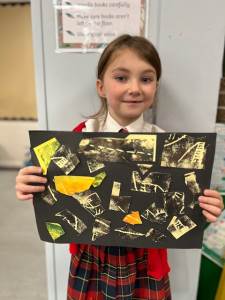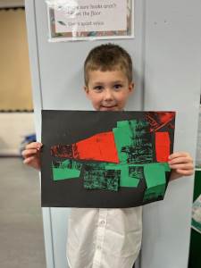 Class 2's Art topic was 'Map it out' - they made abstract art out of printed maps of their journey to school. They enjoyed printing and then using their own prints to create a piece of abstract art. Well done!
